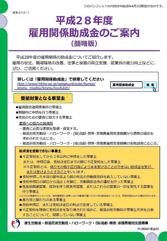 平成28年4月1日時点での雇用関係助成金のパンフレットです。